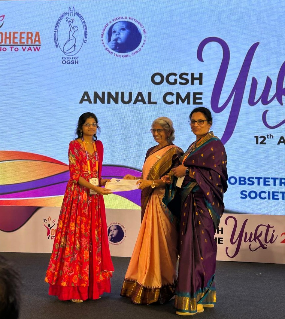 We are proud to announce that Dr. Shreya, a second-year PG student at Kamineni Academy of Medical Sciences and Research Centre (KAMSRC), LB Nagar, has won the First Prize for Poster Presentation at the YUKTI 2026 Annual CME. The award was presented by Dr. Jayanti Reddy, President of the Obstetrics and Gynaecological Society of Hyderabad (OGSH). This achievement highlights the academic excellence and research commitment at KAMSRC.